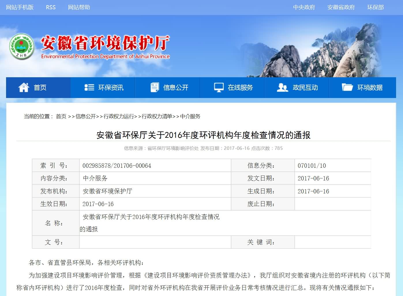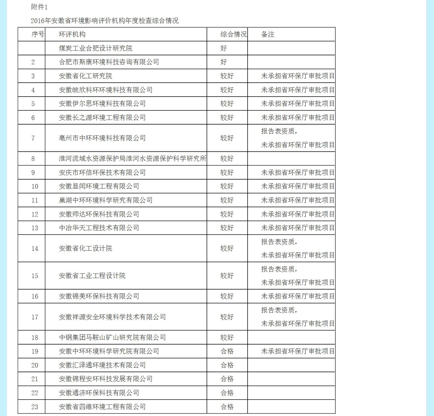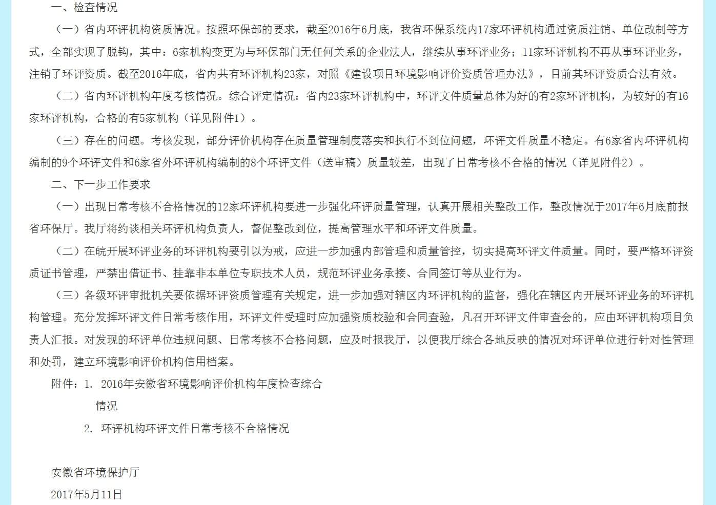 安徽省環(huán)保廳文件:安徽省環(huán)保廳關(guān)于2016年度環(huán)評(píng)機(jī)構(gòu)年度檢查情況的通報(bào)